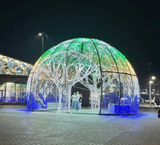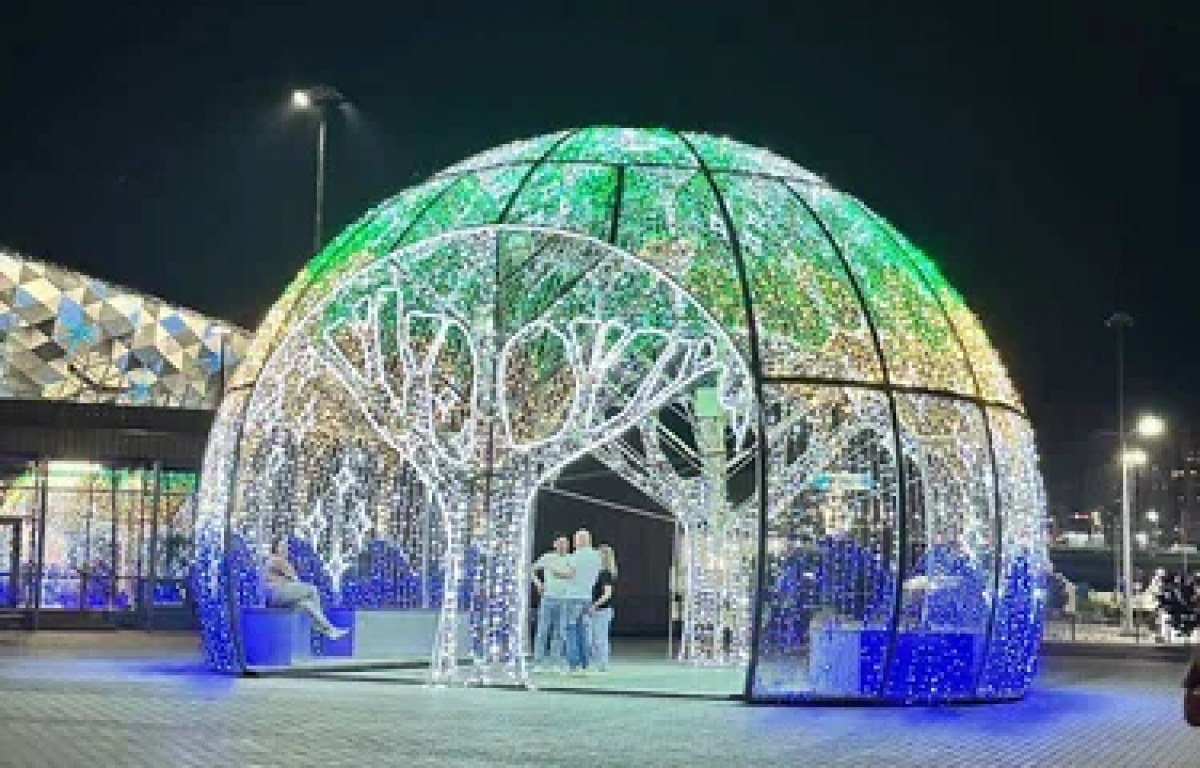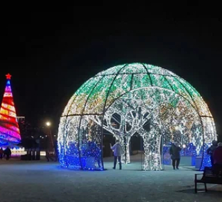 Главный вход ориентирован на фасад ледового дворца, его можно узнать по арт-объектам: сферической беседке-«купольник» и инсталляции «Северное сияние». На стенде у входа — карта с зонированием и маршрутами.