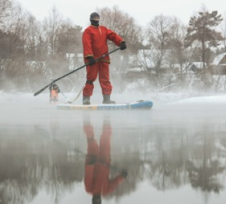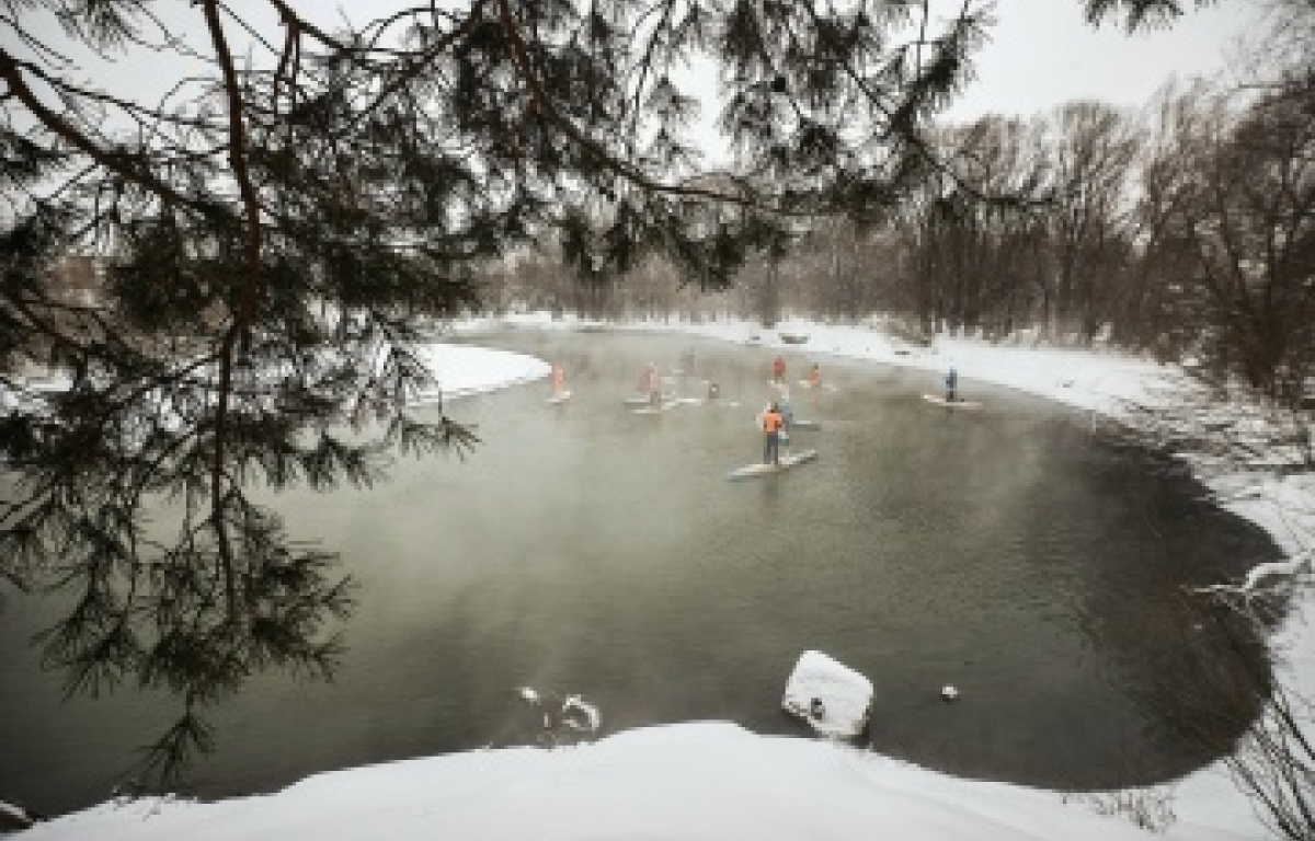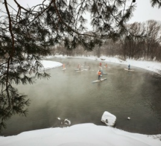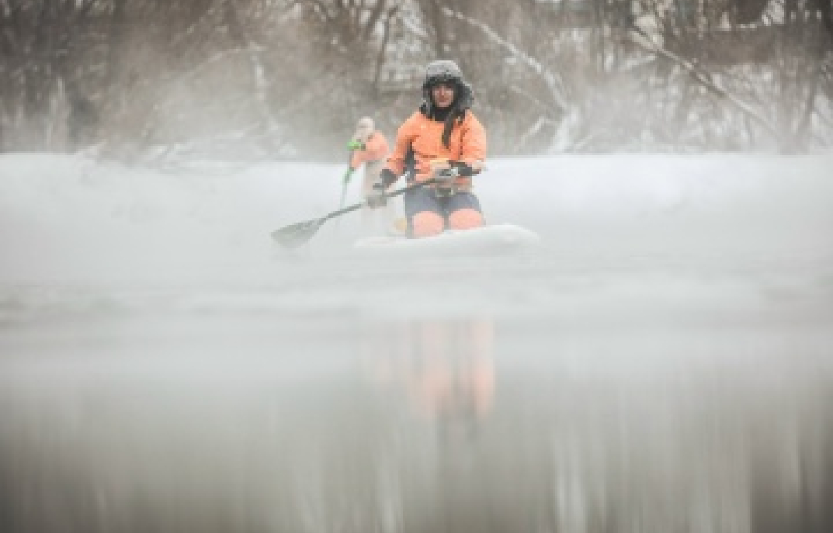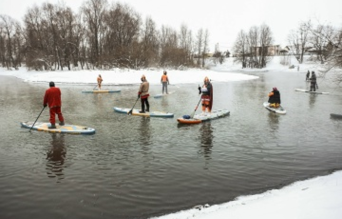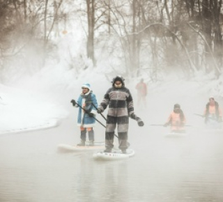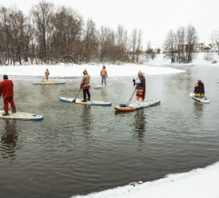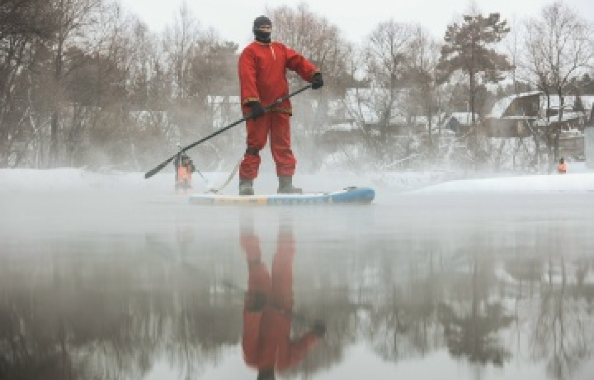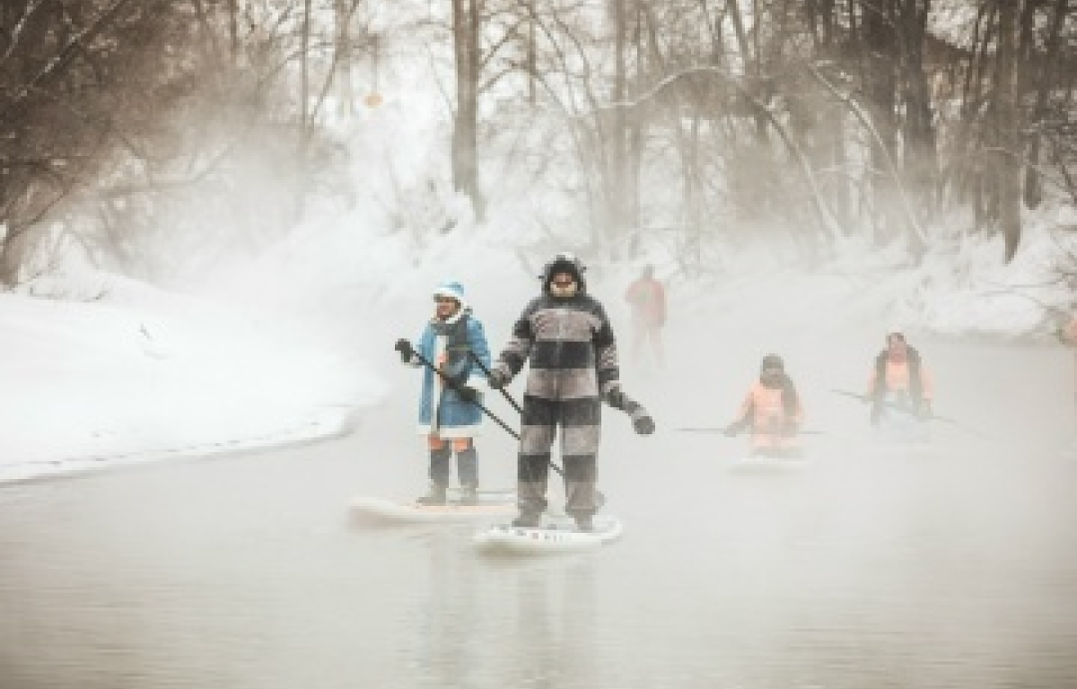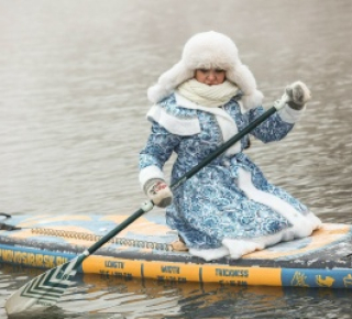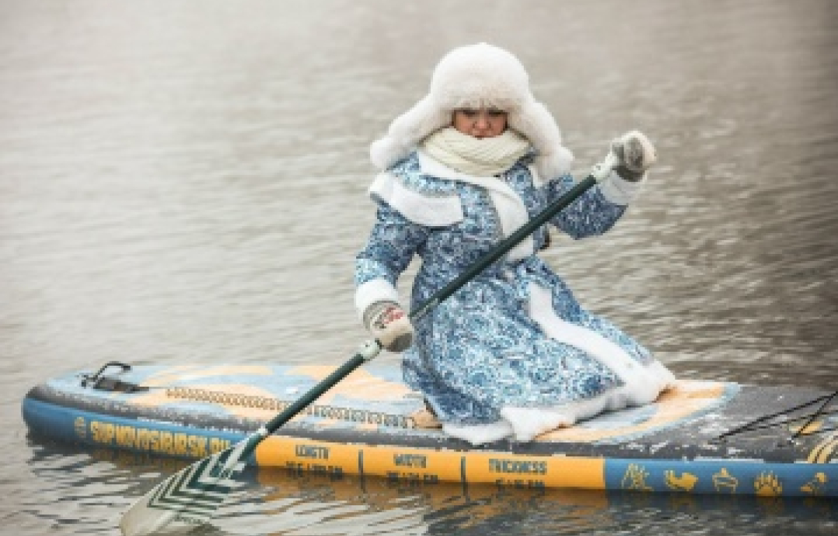 Новогодний заплыв на сапах в Новосибирске: Снегурочки и богатыри покоряют зимнюю воду