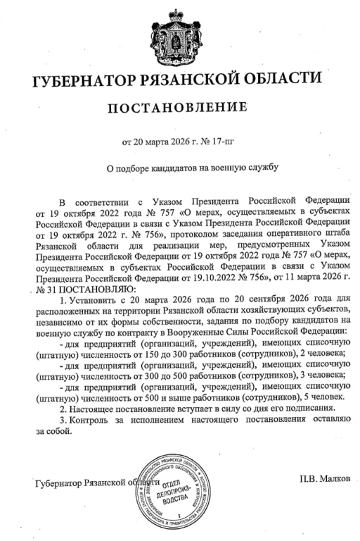 На предприятиях Рязанской области стартовала беспрецедентная кампания: началась вербовка контрактников для отправки на передовую. Губернатор Павел Малков подписал постановление, вводящее в действие новый, как отмечается, первый в России, механизм привлечения военнослужащих по контракту.